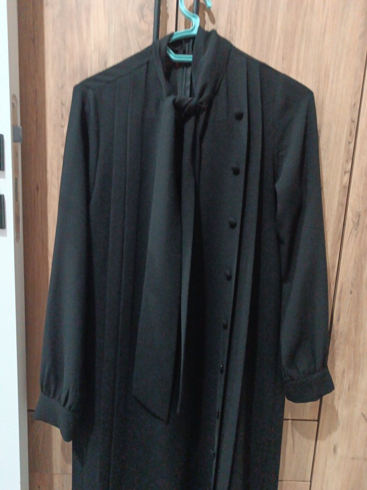 Uzun kollu, düğmeli siyah pantolon üstü, sentetik kumaştan üretilmiştir. Notched lapel yakaya sahip, düzenli kesim ve ofis ortamına uygun modest goth tarzında.