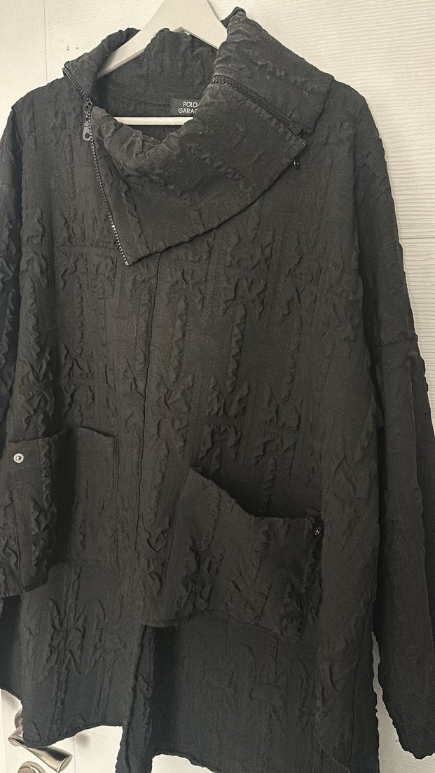 Siyah keten kumaştan, düğmeli, uzun kollu ve bol kesim hamile ceketi. Notched lapel yakalı, gotik tarzda, günlük kullanıma uygun.