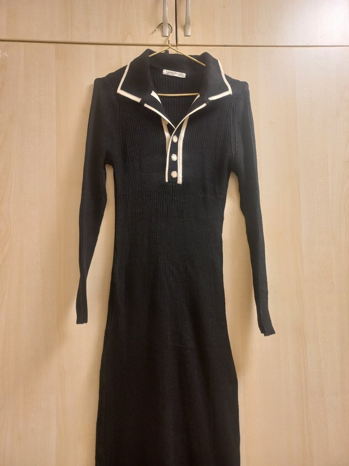 Düğmeli, yakalı ve uzun kollu siyah triko elbise, günlük kullanıma uygun şık ve rahat bir görünüm sunar.