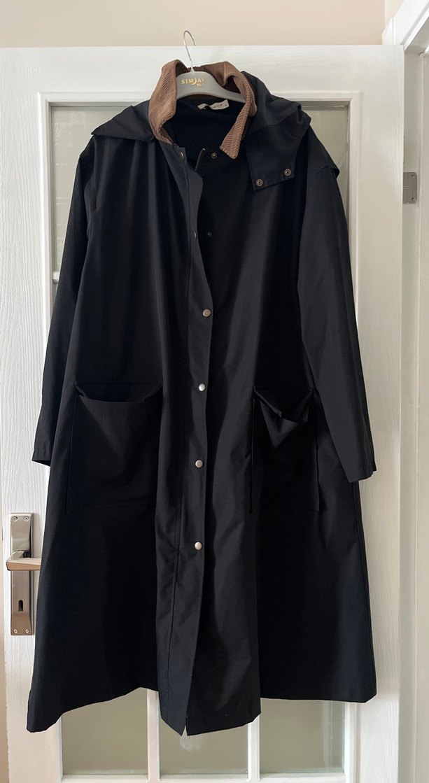 Düğmeli, bol kesim siyah uzun kaban.Uzun kollu ve yapay kumaştan üretilmiştir. Günlük kullanıma uygundur. Beden S ama çok bol olduğu için XL bedene kadar uyumludur. Hamilelerde rahat kullanabilir.