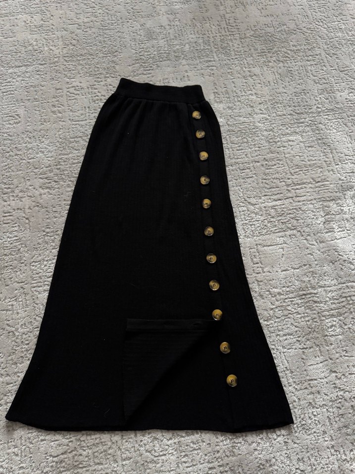 Düğmeli detaylı, siyah uzun etek, bol kesim ve sentetik kumaştan üretilmiştir. Günlük rahat ve gotik tarz için uygundur. Etiketi kesik Massimo dutti