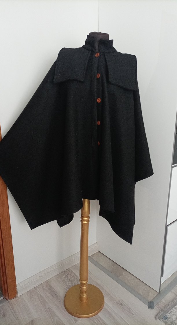 Düğmeli, yün kumaştan uzun siyah kadın panço. Notlu yaka ve uzun kollu, rahat kesimli, ofis için uygun, desensiz ve gotik tarzda.