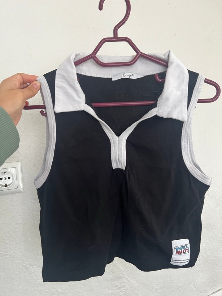 Düğmeli, kolsuz siyah crop top, V yaka ve beyaz kontrast yakaya sahiptir. Pürüzsüz sentetik kumaştan yapılmıştır, günlük sokak stiline uygundur.