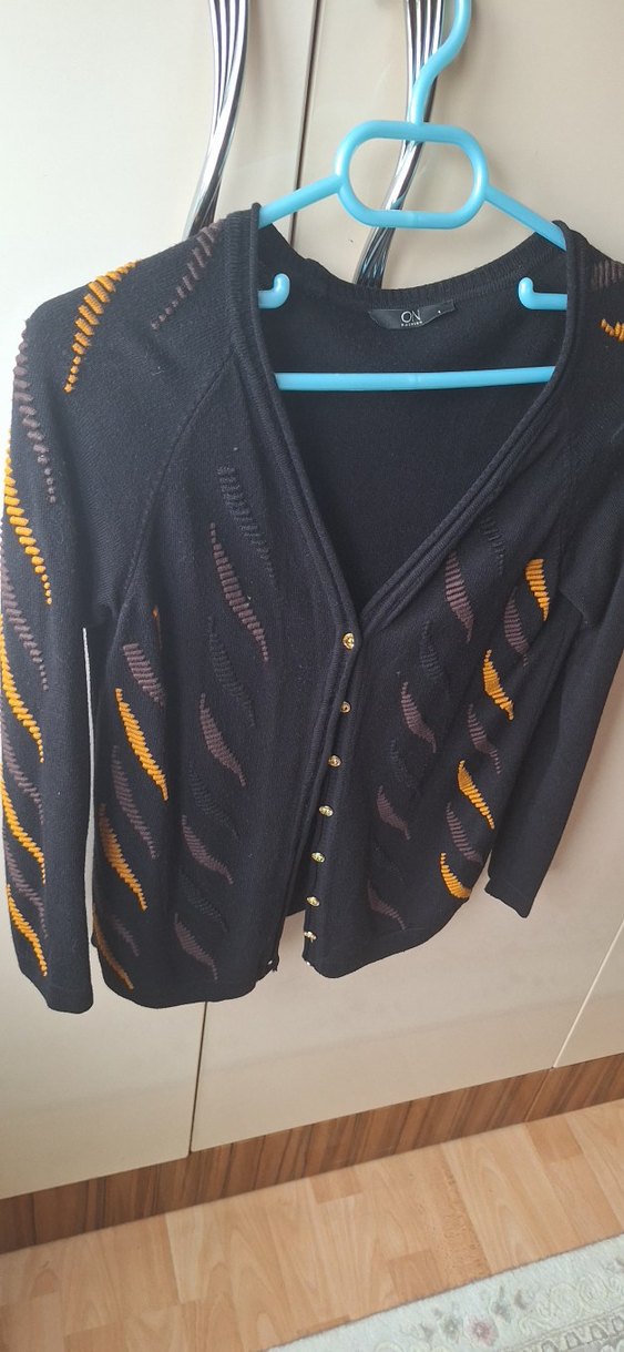 Düğmeli, V yakalı, uzun kollu siyah örgü kadın hırka. Desenli ve vücuda oturan kesime sahip, günlük kullanıma uygun avant-garde tarzda.