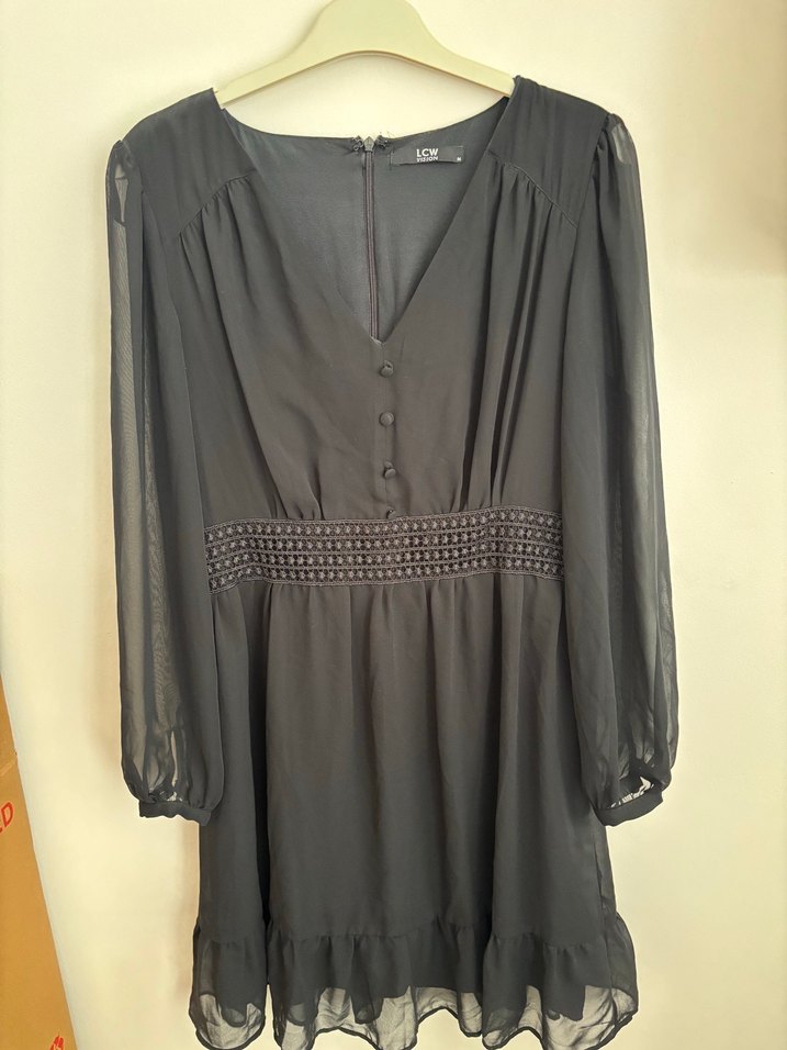 Siyah elbise, V yaka, uzun kollu, düğmeli ve nakış detaylıdır. Salaş kesimiyle romantik akşamlar için uygundur.