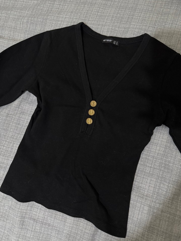 Siyah kumaştan, düğmeli V yaka ve uzun kollu kadın body. Dar kesimi ve minimalist tarzıyla trend günlük kullanıma uygundur.