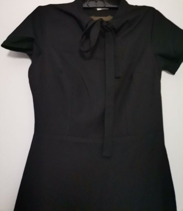 Düğmeli ön kısmı ve kısa kollu siyah kadın elbise V yaka, midi boy ve normal kesimle ofis için uygun.