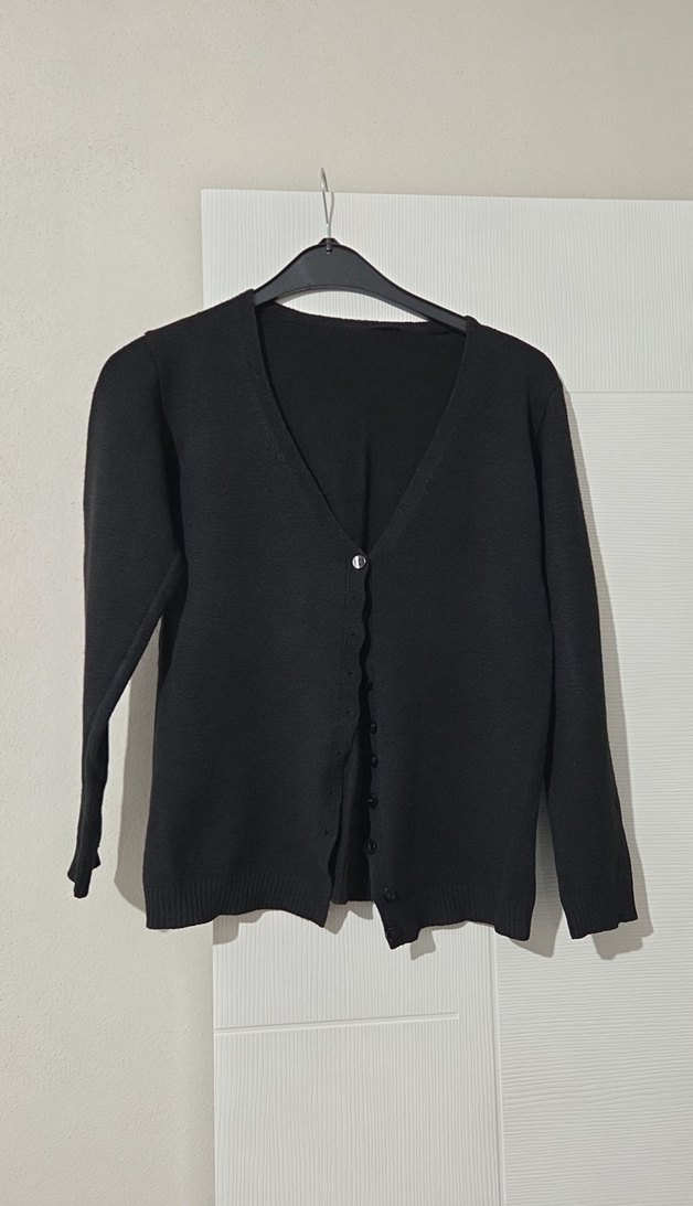 Düğmeli, V yakalı siyah örme hırka, bol kesim ve uzun kolludur, günlük kullanıma uygundur.
