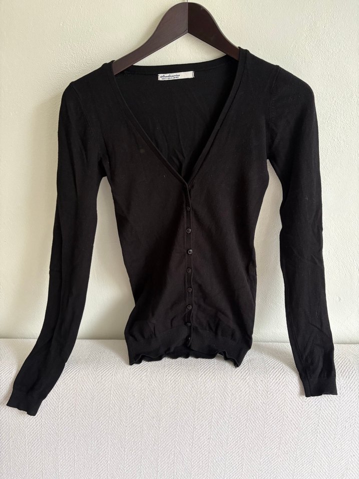 Pamuk kumaştan üretilmiş, uzun kollu, düğmeli, V yakalı, siyah ve dar kesim kadın hırka. Minimalist ve gotik tarzda, günlük kullanıma uygun.