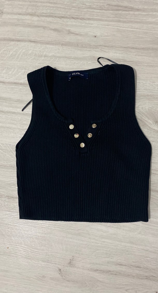 Düğmeli, siyah, V yaka, kolsuz ve ince triko dokulu bu süveter, günlük sokak stili için uygundur. Rahat ve şık bir görünüm sunar.