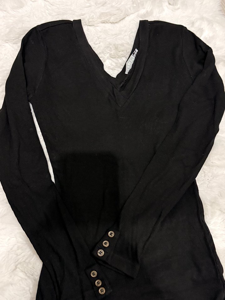 Düğmeli manşetleri ve V yaka detayları olan, yumuşak ve esnek kumaştan yapılmış siyah, düz ve vücuda oturan kadın trikosudur. dekolte kısmı çok açık