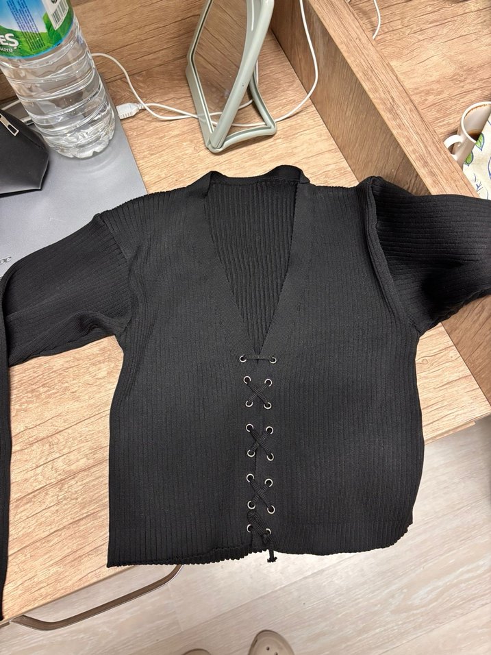 Düğmeli ve bağcıklı ön detaylı, v yaka, uzun kollu, siyah triko, gövdeyi saran kesimle gotik tarzda midi uzunlukta kazak.