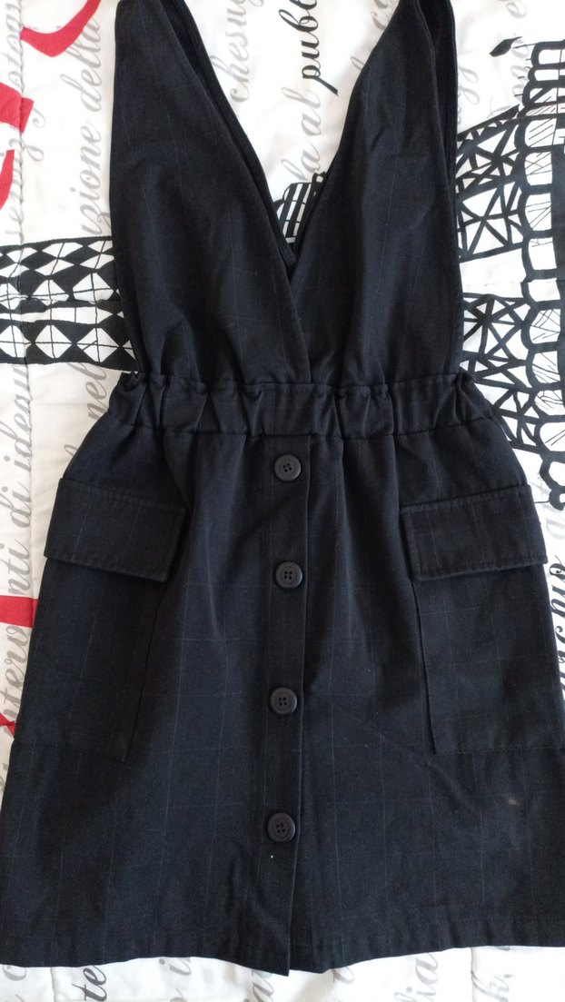 Düğmeli ön kısmı ve V yaka detaylı, askılı, siyah kumaş tulum. Midi boyda, dar kesim ve cep detaylıdır.