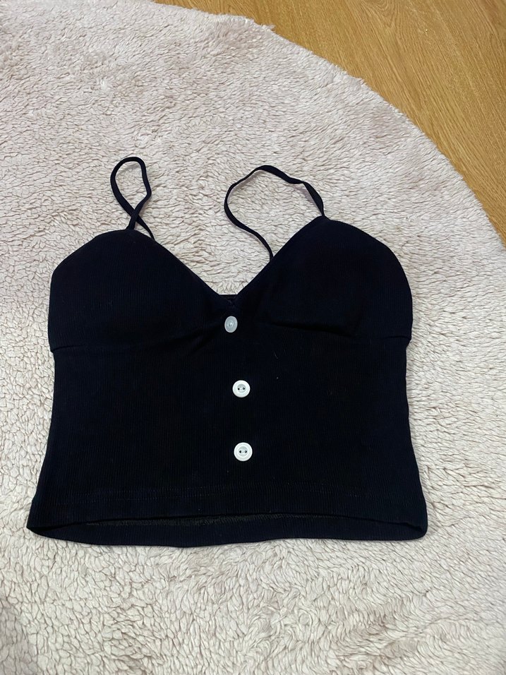 Siyah, düğmeli ve V yaka olan bu mini büstiyer, ince örme kumaştan üretilmiştir. Kolsuz yapısı ve rahat kesimiyle günlük sokak stiline uygundur.