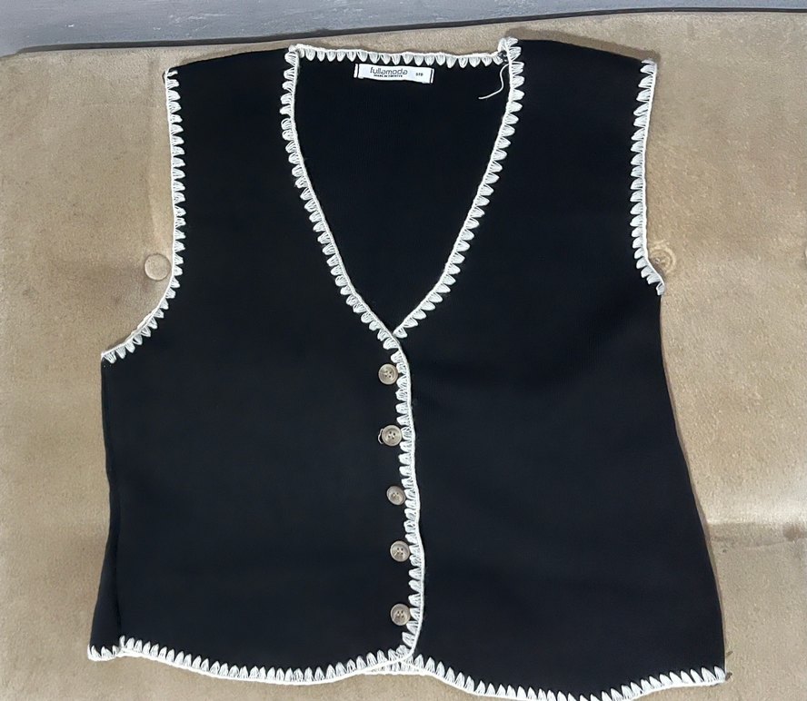 Düğmeli, V yaka ve nakış detaylı siyah kadın yeleği. Kolsuz, tekstil malzemeden, midi boyda ve günlük kullanıma uygun.