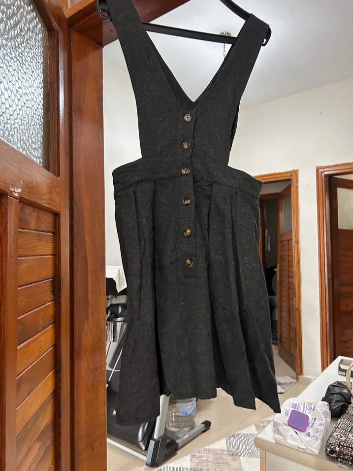 Düğmeli, v yaka ve salaş kesime sahip kadın triko elbise. Yün kumaştan, kolsuz ve midi boyda, ofis için uygun siyah renkte vintage goth tarzında.