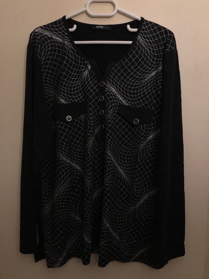 Siyah, V yaka ve uzun kollu, düğmeli detaylı, bol kesim, desenli sentetik kumaştan gotik tarzda bluz.