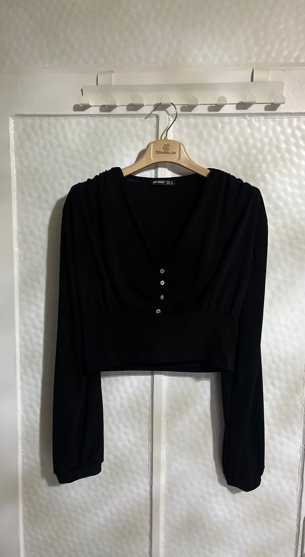 Düğmeli, V yaka ve uzun kollu, siyah renkli, ince ve şık dokulu, minimalist gotik tarzda, gündelik kullanıma uygun kadın bluz. Defosu görselde mevcut