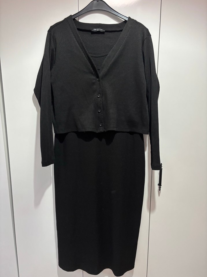 Düğmeli, V yakalı, uzun kollu ve uzun boylu siyah triko elbise, ofis kullanımı için uygundur. Sentetik kumaştan yapılmıştır.
