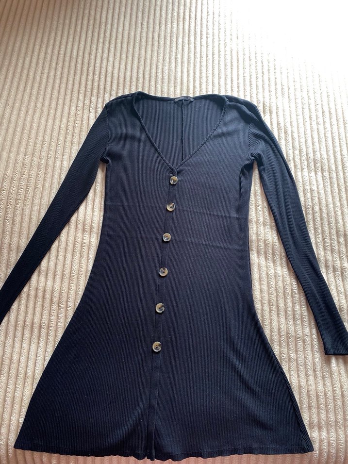 Düğmeli ve V yakalı bu siyah triko elbise, uzun kollu ve vücuda oturan kesimiyle günlük kullanıma uygundur. Sentetik kumaştan üretilmiştir. derin v yaka dekolte.
