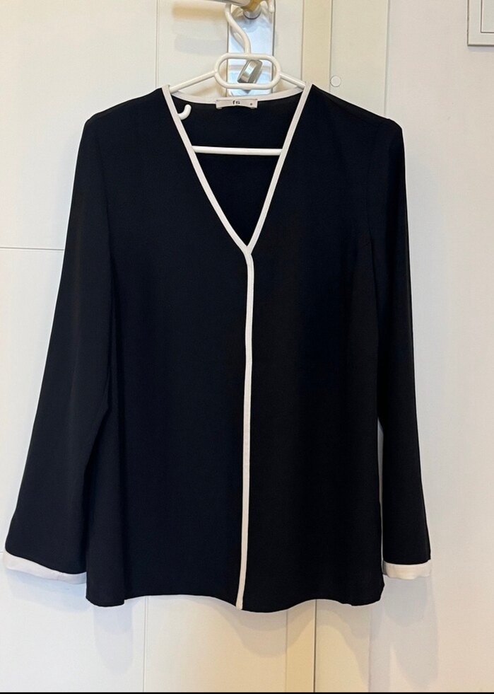 Siyah, beyaz kenarlı V yakalı, uzun kollu ve düğmeli kadın bluz. Ofis kullanımı için uygun, ipeksi dokulu ve normal kesim.