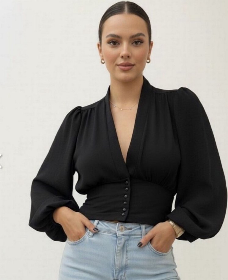 Düğmeli Siyah V Yakalı Kadın Bluz ayrobık kumastır