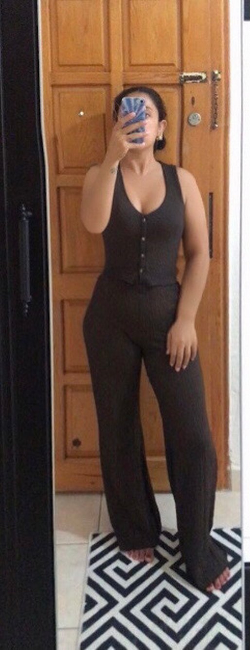 Düğmeli, V yakalı, kolsuz, acı kahve cesur ve günlük tarzda yelekli ikili takım