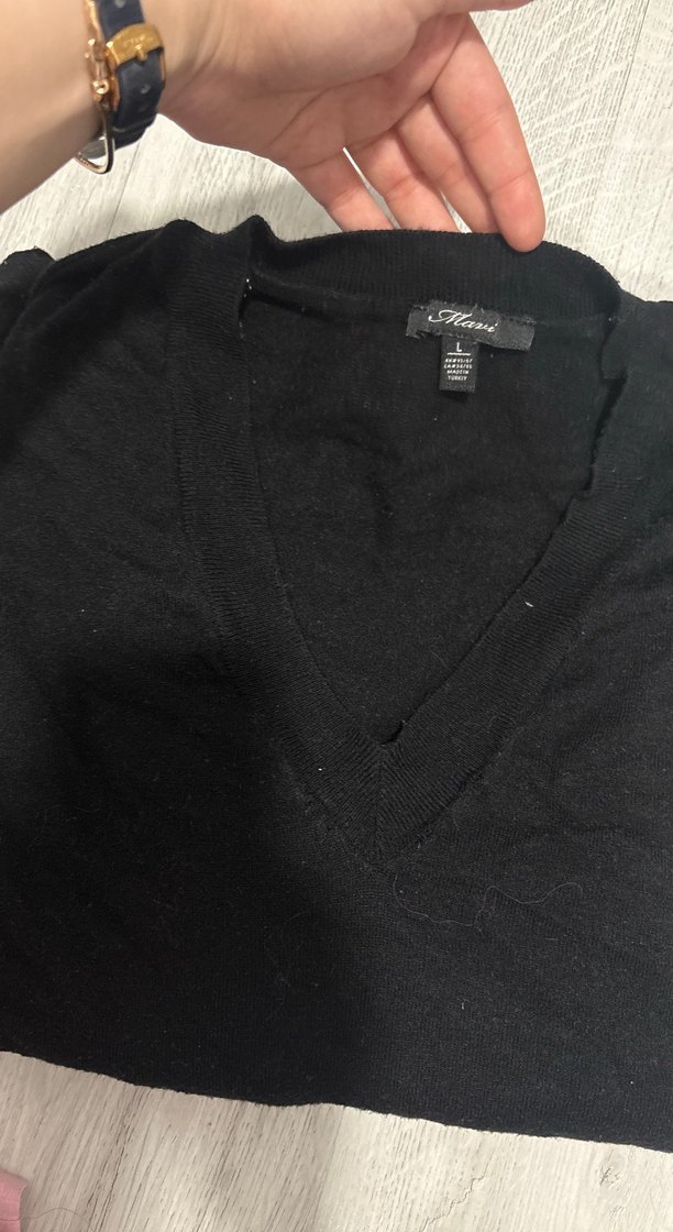 Yumuşak yün kumaştan yapılmış, uzun kollu ve V yakalı, düğmeli, siyah ve vücuda oturan kadın kazak. Günlük ve ofis kullanımı için uygundur.