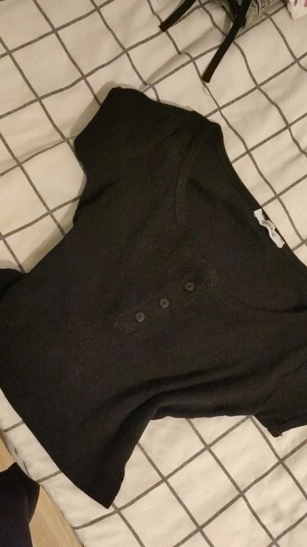 Düğmeli Siyah V Yakalı Kadın Tişört
