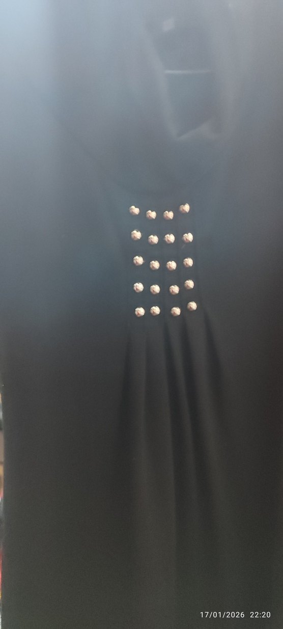 V yakalı, düğmeli ve nakış detaylı siyah, uzun ve kolsuz, vücuda oturan gece elbisesi. Minimalist gotik tarzda parti için uygundur.