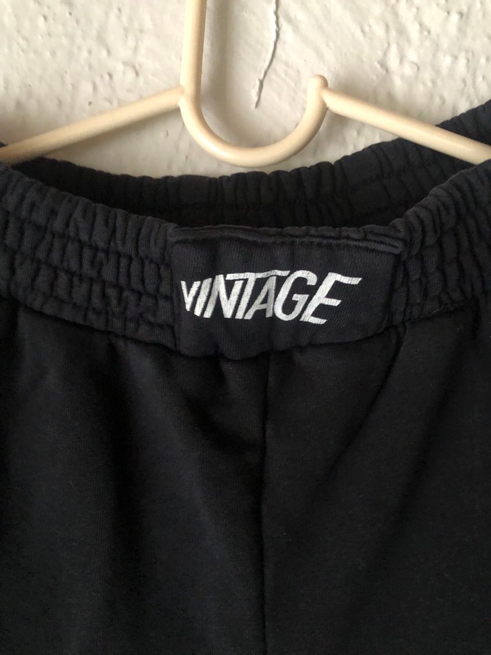 Düğmeli detaylara ve baskılı desene sahip, yumuşak ve sıcak kumaştan yapılmış, bol kesim siyah kadın eşofman altı. Lastikli bel kısmında 'VINTAGE' etiketi bulunur.
