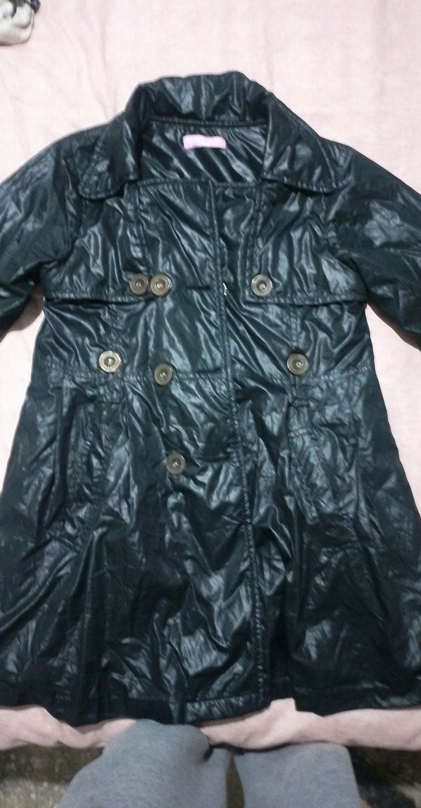 Düğmeli ve kesimli yakalı, siyah midi uzunlukta, sentetik kumaştan yapılmış dar kesim yağmurluk. Sokak stili için uygun. ☔