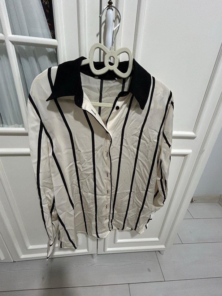 Düğmeli, uzun kollu, siyah yakalı ve çizgili beyaz gri gömlek. Rahat kesim ve sentetik kumaştan üretilmiştir. Günlük sokak stili için uygundur.