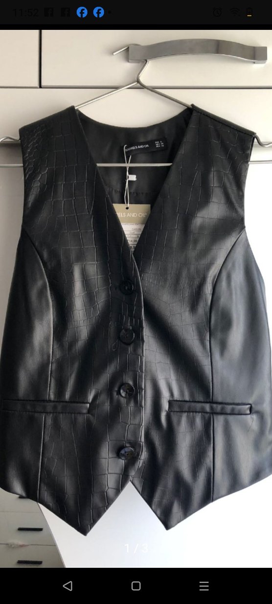 Düğmeli ön ve kırma yakalı siyah yılan derisi desenli, kolsuz deri yelek. Normal kesim, ofis ve sokak tarzına uygun.