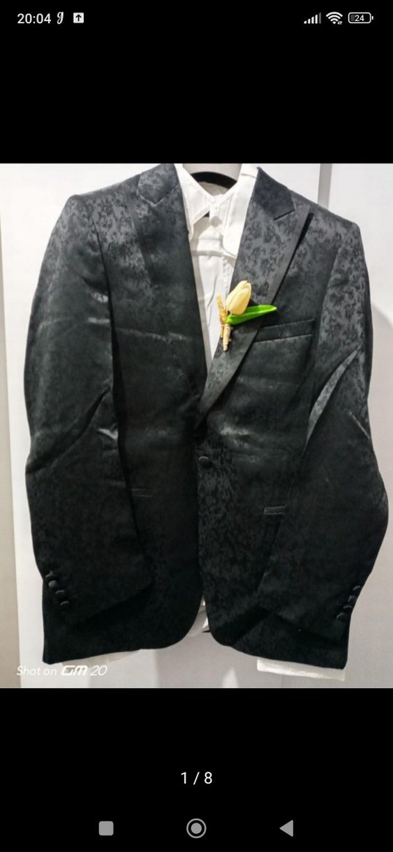 Düğmeli, yılan desenli siyah erkek takım elbise. Normal boy, uzun kollu ve klasik kesim, düğünlerde kullanıma uygundur.