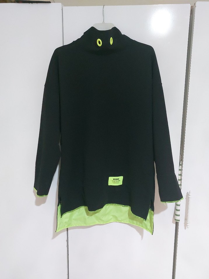 Düğmeli, yüksek yakalı, uzun kollu siyah sweatshirt. Neon yeşil etek ucu ve baskılı detaylarla sokak ve spor tarzı birleşimi.