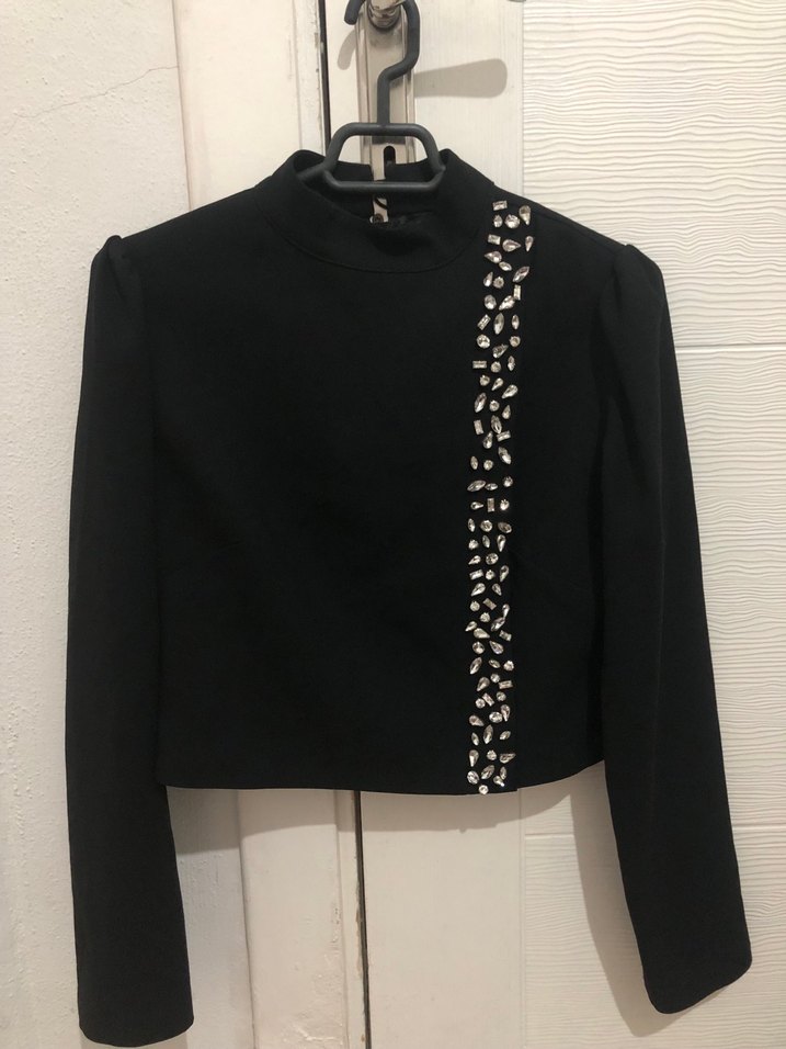 Düğmeli ve nakış detaylı, yüksek yakalı, uzun kollu siyah mini bluz. Dar kesimi ve kısa boyu ile şık ve trend bir görünüm sunar.