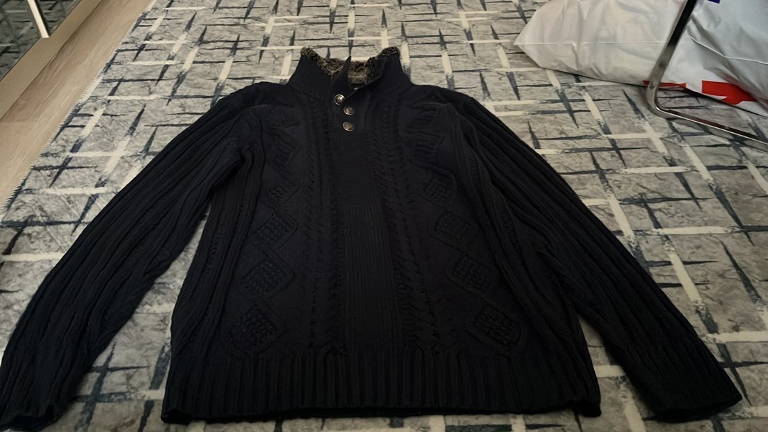 Düğmeli yakası ve yüksek yakası olan, desenli örgü kumaştan yapılmış siyah, bol kesim uzun kollu kazak. Günlük kullanıma uygundur.