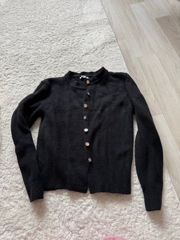 Düğmeli, uzun kollu siyah yün hırka, yuvarlak yaka ve rahat kesime sahiptir. Günlük kullanıma uygun midi boyda, konforludur. İki kez kulağında sadece hiçbir sorunu yoktur