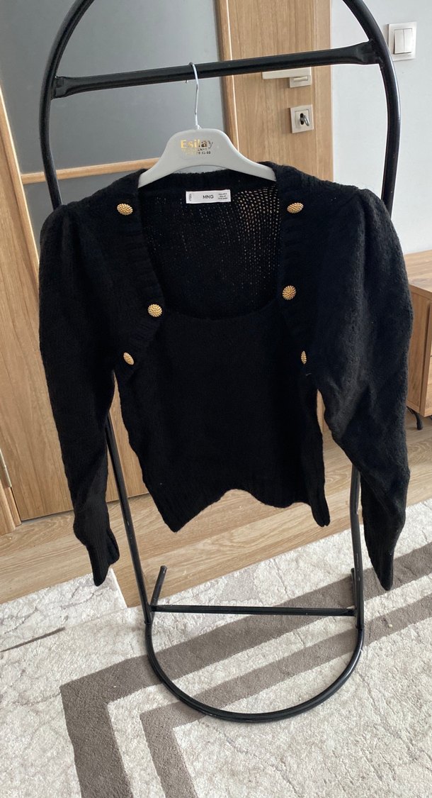 Siyah yün, düğmeli, uzun kollu, yuvarlak yakalı ve bol kesimli kadın kazak. Günlük rahat kullanıma uygundur.