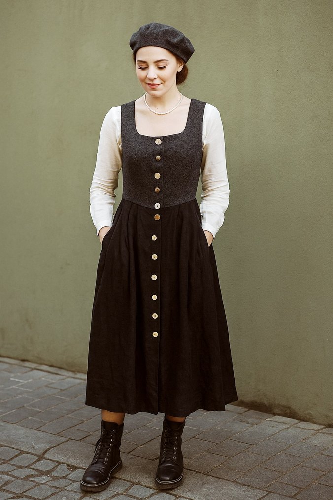 Düğmeli, askısız ve kolsuz siyah yün midi elbise, bol kesim vintage ve gotik tarzı yansıtıyor.