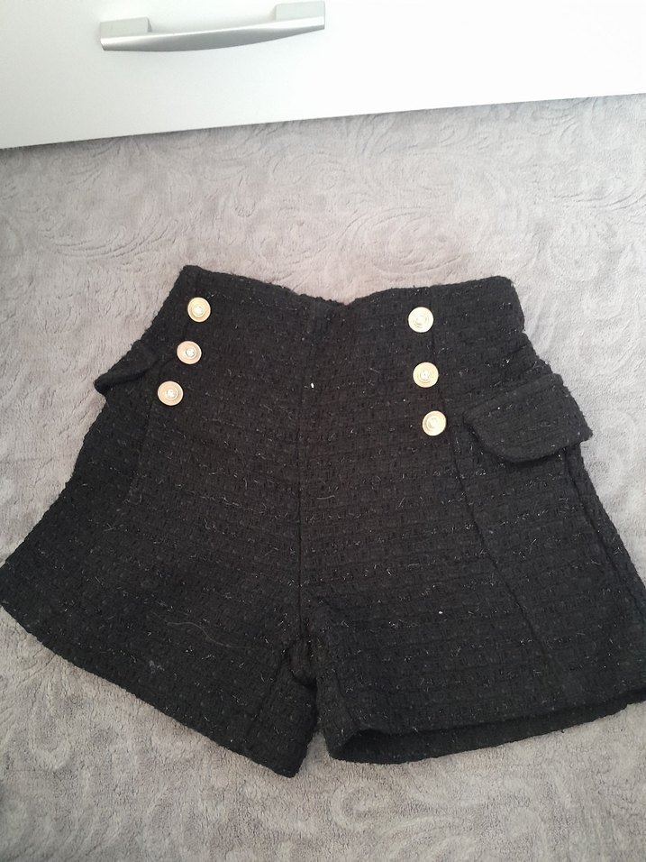 Düğmeli detaylara sahip siyah, yün kumaştan yapılmış, yüksek bel, dar kesim mini şort. Günlük kullanım için uygun, sokak tarzında.