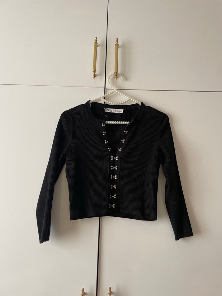 Uzun kollu, V yakalı, düğmeli siyah triko bolero. Fit kesimi ve gotik tarzıyla dikkat çeker. Siyah Zara crop