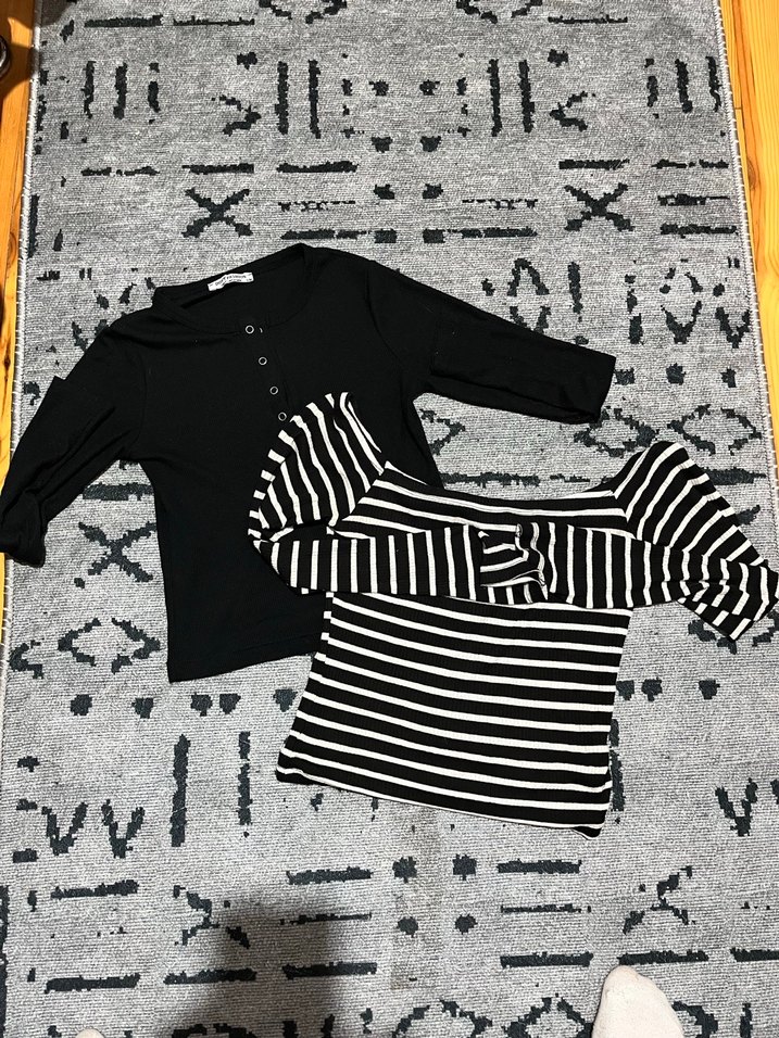Düğmeli, uzun kollu, tekne yakalı hamile bluz. Siyah pamuk kumaş üzerinde zebra desenli, rahat ve şık günlük kullanım için uygun.