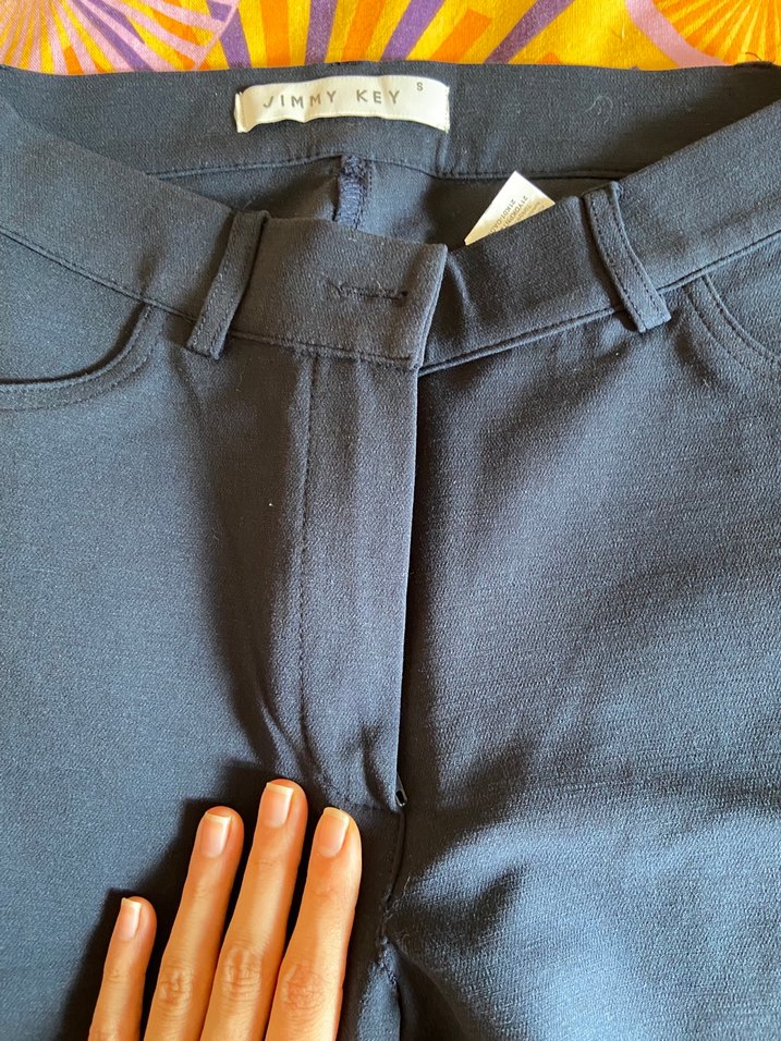 Düğmeli, orta boy, gri kumaş pantolon. Ofis için uygun, vücuda oturan kesim ve sentetik pürüzsüz kumaş.
