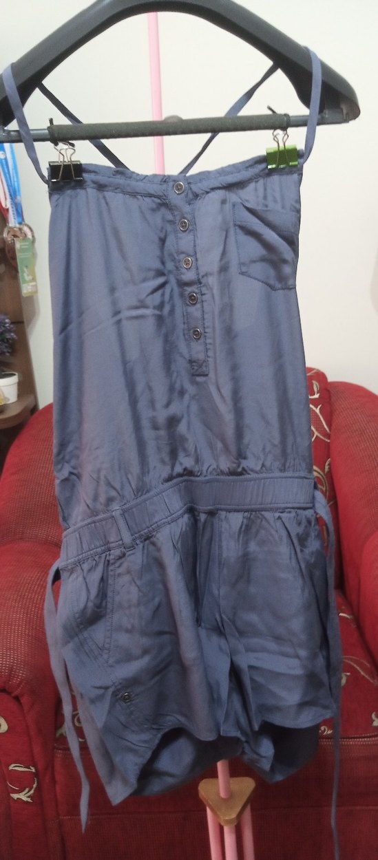 Düğmeli, straplez, mavi renkli, sentetik kumaştan yapılmış, bol kesim, günlük kullanıma uygun kadın tulum. yırtık sökük yoktur