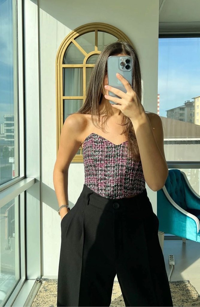 Düğmeli ön yüzü ve koyu pembe batik desenli kısa straplez büstiyer. Sentetik kumaştan, regular fit, trend sokak stili için uygun. Ürün orijinal sıfırdır. Etiketi düşmüş bu sebeple uyguna koyuyorum