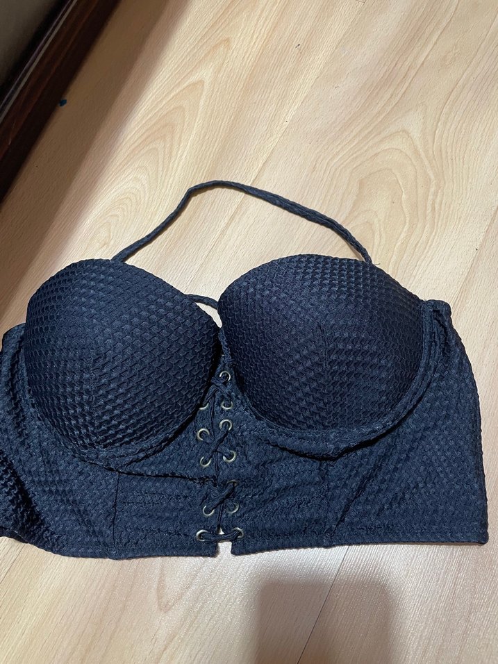 Sentetik kumaştan yapılmış, strappy askılı, boyundan bağlamalı straplez yakalı, siyah renkli, gothic tarzda fitted bustiyer.