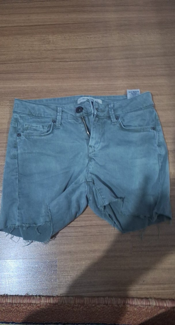 Düğmeli, ince kumaş, su yeşili renkte, kısa ve dar kesim, likralı kot şort. Günlük sokak stiline uygun, desensiz tasarım.