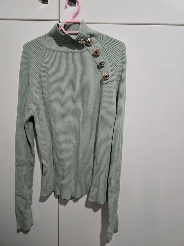 Düğmeli, yarım balıkçı yaka ve uzun kollu, su yeşili renk triko kazak. İnce ve vücuda oturan kesimiyle günlük sokak stiline uygun